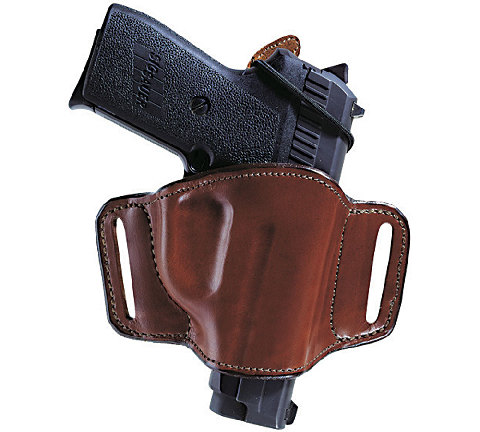Premium, full grain leather. Minimalist design with hammer retainer tab. Suede lined with border stitching. Belt slide design that slides on and off waistbelt for a low-profile look. Slots designed to pull firearm in close to body and fits belt widths up to 1 3/4".